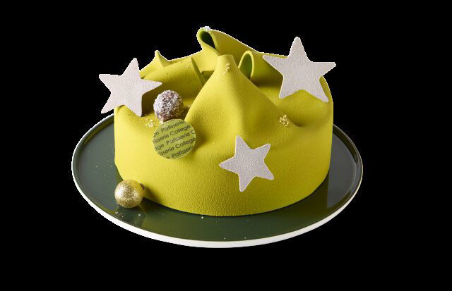 Zachte cake met amarenenkersen crème en pistache mousse Omhuld met marsepein en afgespoten met chocolade 6 persoons